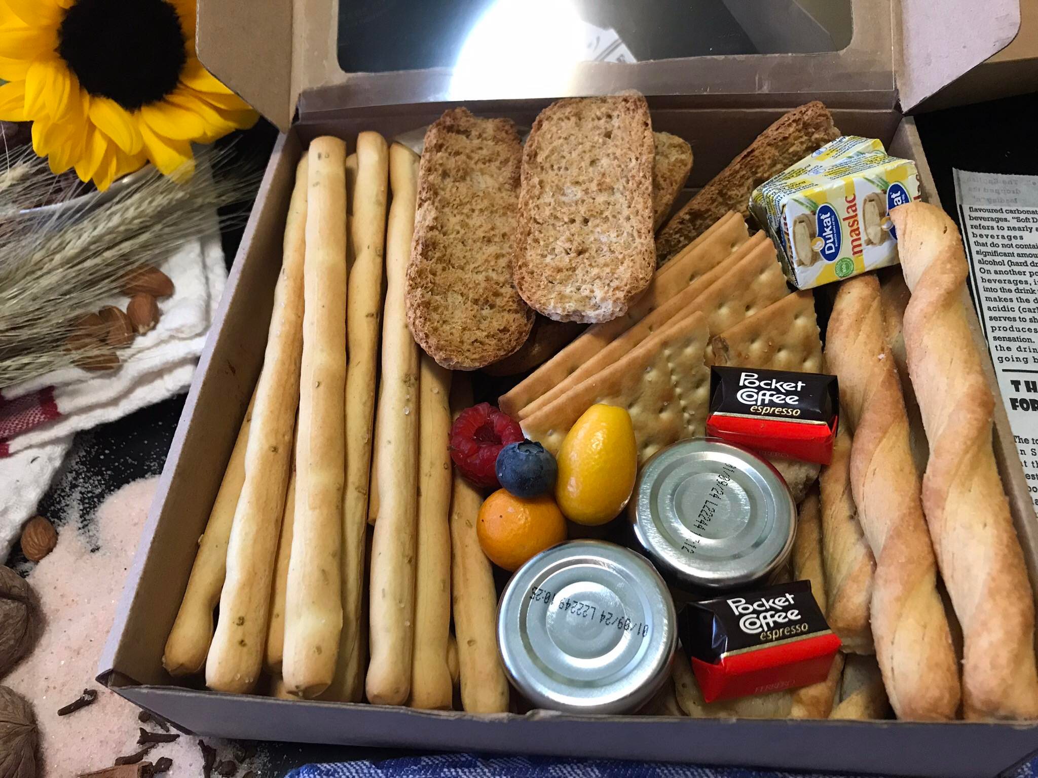 Integralni crni kruh, grisini, krekeri, maslac, voćni džem, Pocket coffe
