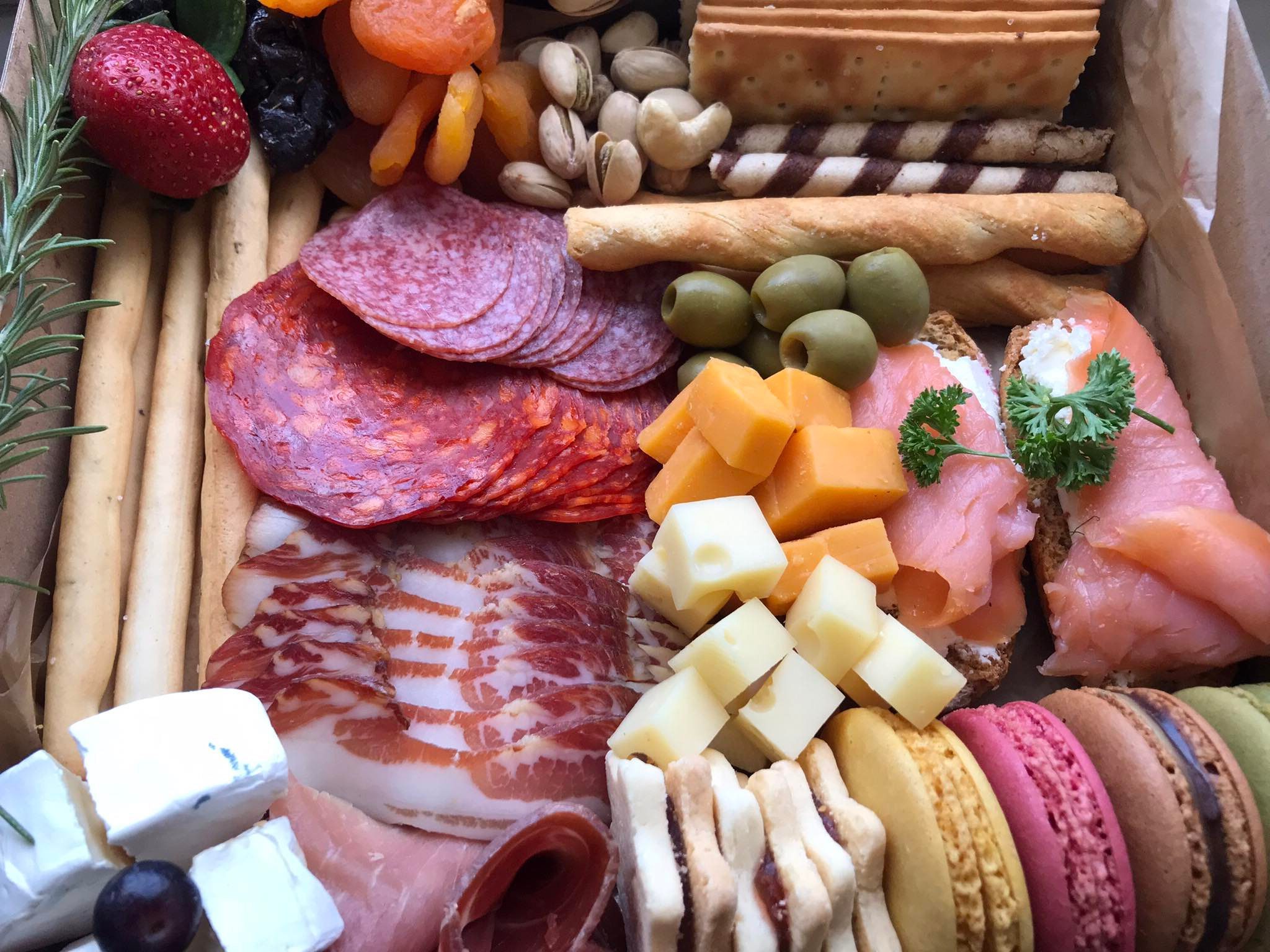 4 vrste hladnih narezaka, 3 vrste sira, losos sendvič, masline, pistacije, krekeri, grisini, suhe marelice, linzeri, macarons