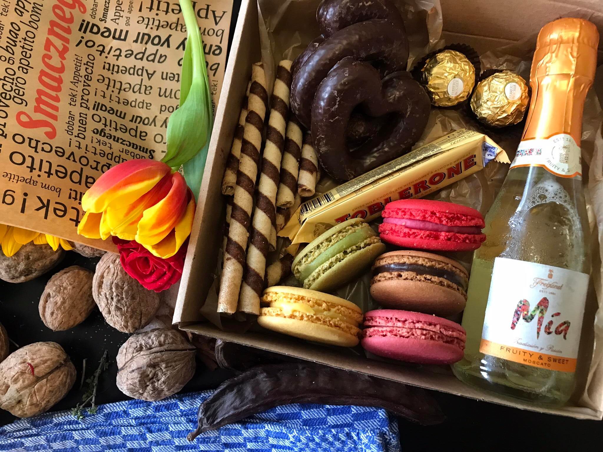 Toblerone, punjeni lolipop, medenjaci, Ferrero rocher, macaronsi, Pjenušavo vino Freixenet Mia