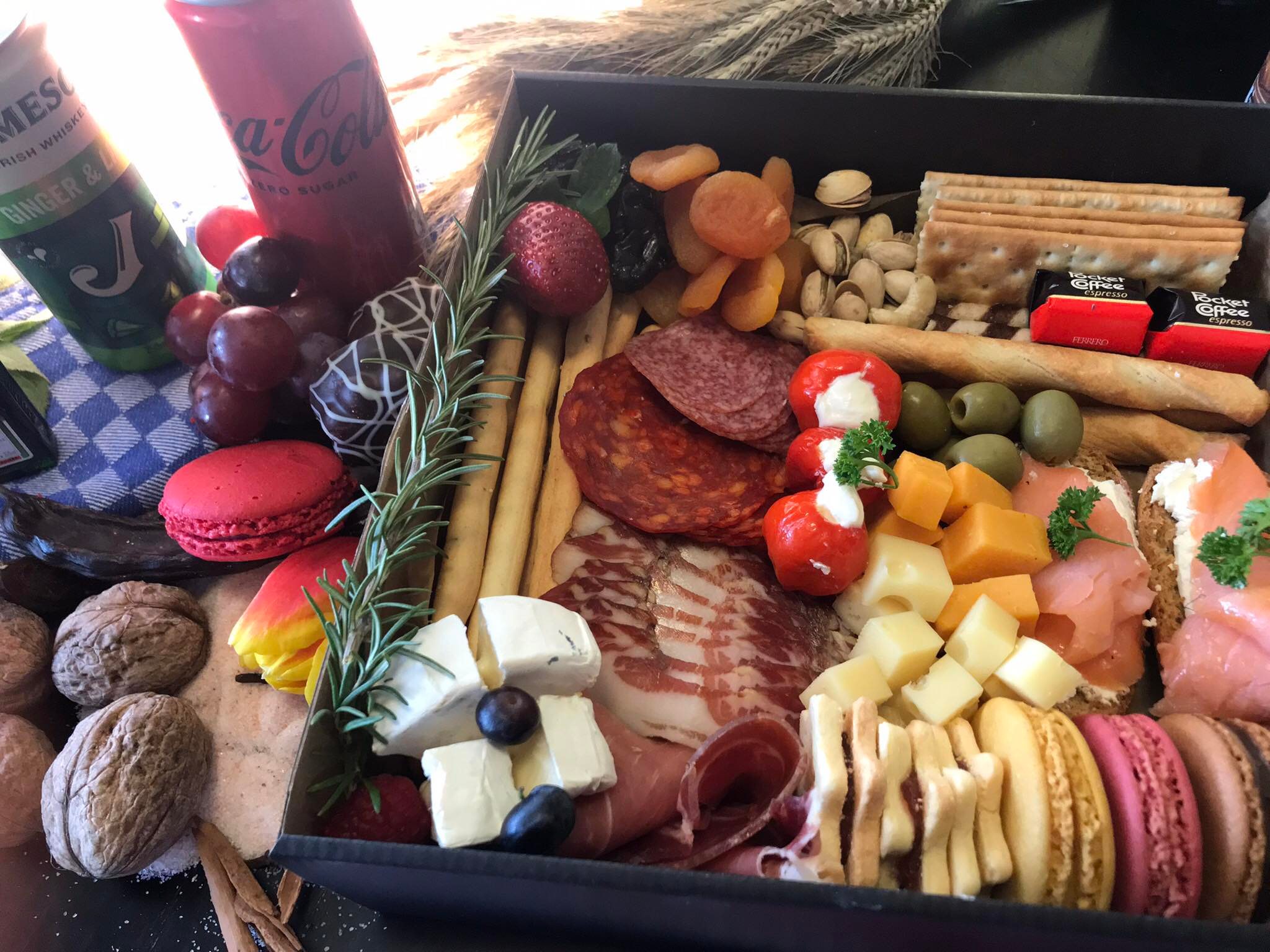 4 vrste hladnih narezaka, 3 vrste sira, 2 kom losos sendvič, masline, grisini, krekeri, pistacija, suhe marelice, linzeri, macaronsi, Pocket coffe, punjeni lolipop
