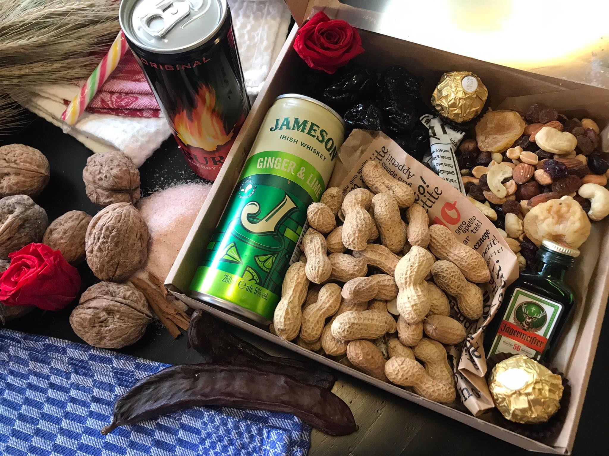 Kikiriki, bademi, indijski oraščič, suhe smokve, Jegermaister, Jameson ginger and lime, suhe šljive, Ferrero rocher